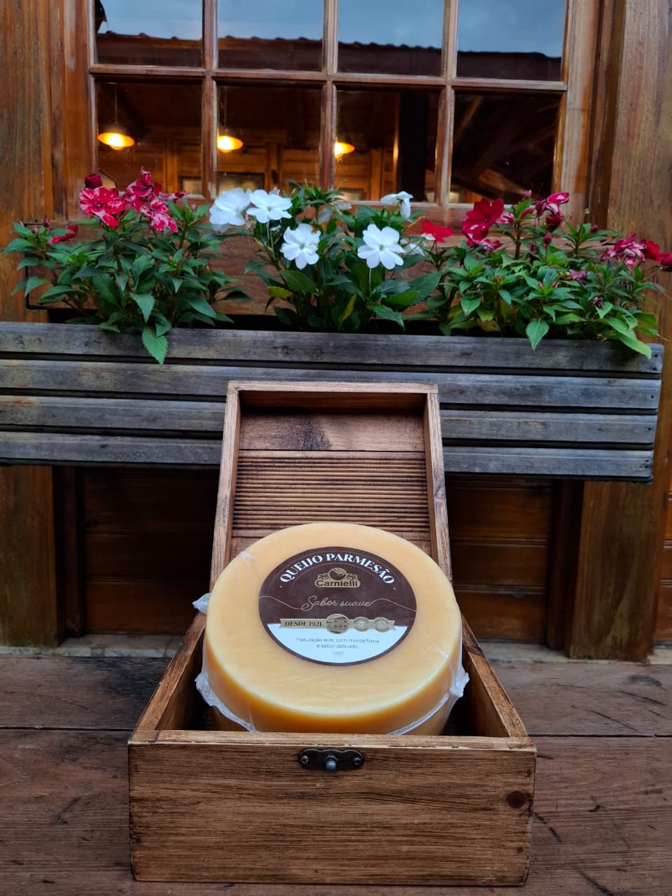 Queijo Parmesão produzido a partir do leite de vaca integral e maturado na Fazenda Carnielli, localizada nas montanhas capixabas. Sabor suave resultado de uma matruração média de 8 meses.